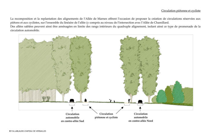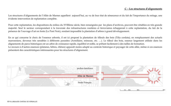 Dans le cadre général du programme de restauration du Parc de Saint-Cloud, la replantation et la requalification de l’allée de Marnes représente une action majeure dont l’exécution apparaît aujourd’hui prioritaire, au vu de l’état des alignements résiduels d’arbres, des lisières et des sols.