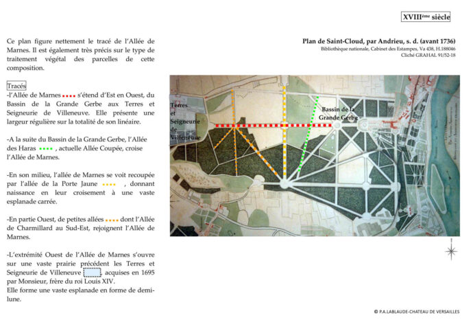 Axe majeur du Domaine de Saint-Cloud, traversant le Grand Parc d’Est en Ouest, l’Allée de Marnes est la principale perspective composée par Le Nôtre dans les années 1670 ; elle structure la partie occidentale du Domaine et se développe sur près d’1,5 kilomètres, entre le Bassin de la Grande Gerbe et la Plaine de Combleval.